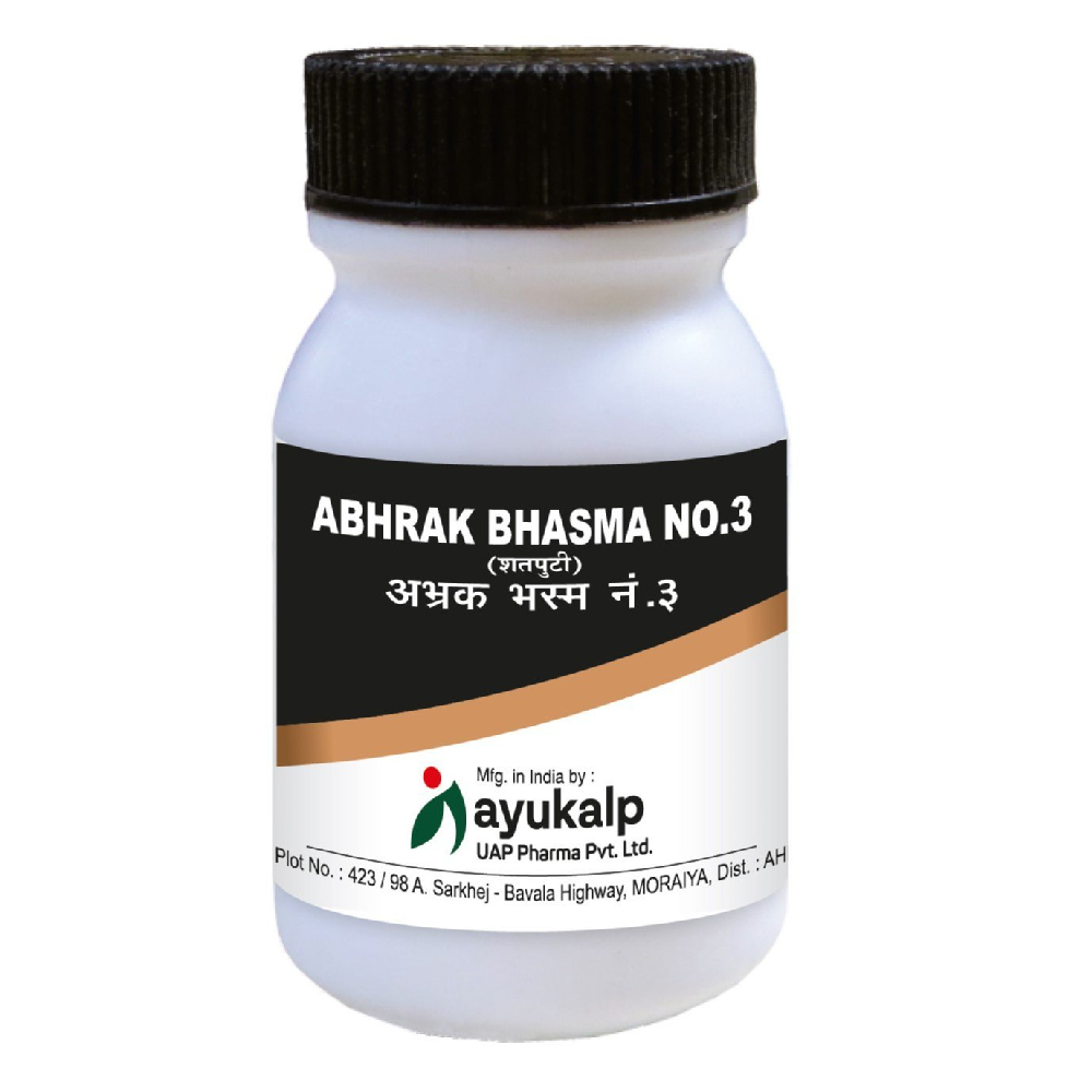 AYUKALP UAP PHARMA PVT LTD Abhrak Bhasma No.3(100 Puti) is a classical Ayurvedic formulation made from calcined mica ash with 100 calcination processes that is an alternative tonic used in chronic asthma and other conditions and is also believed to be useful for cough and dyspnea.