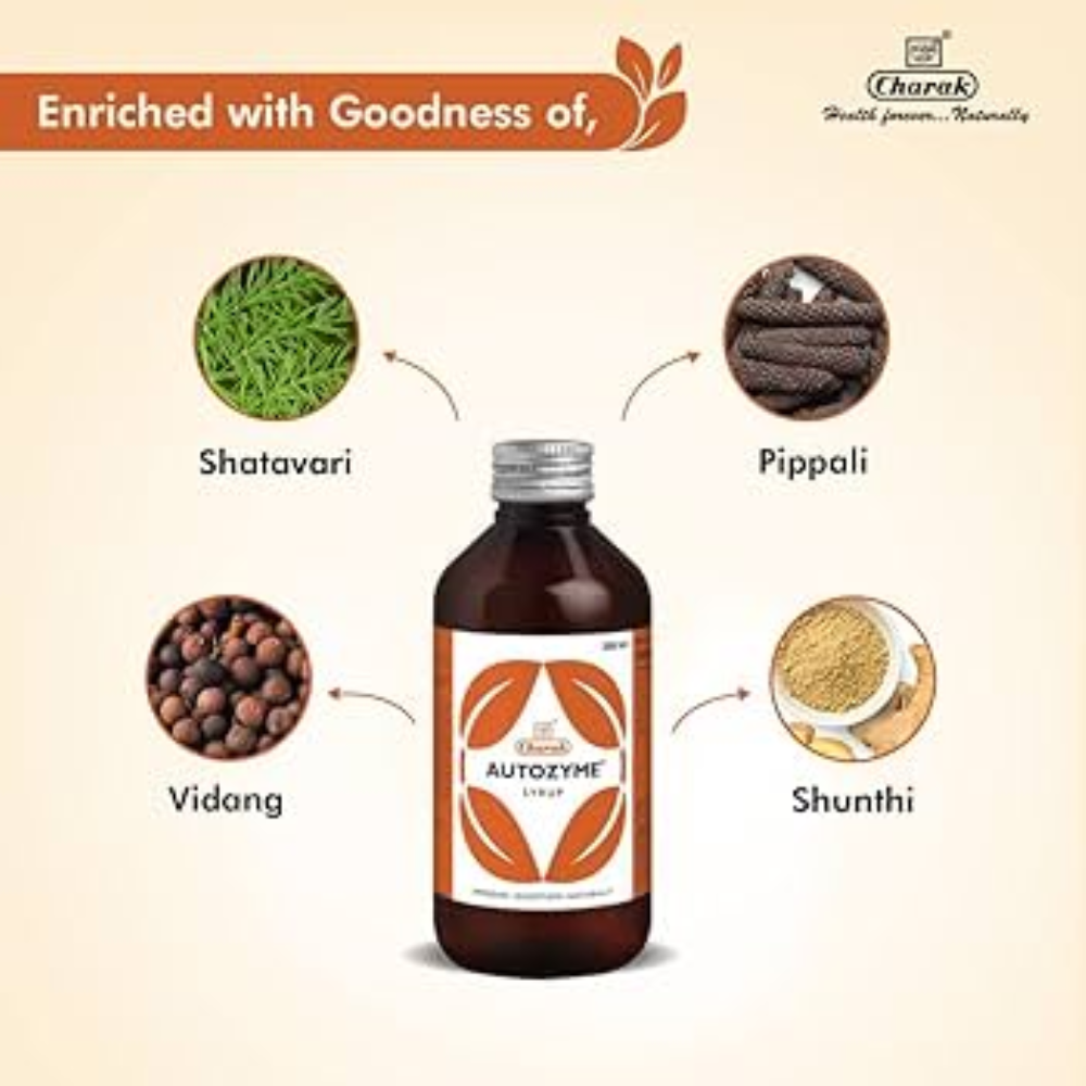 Charak Autozyme Syrup supports digestive health and helps manage indigestion and digestive discomfort. Proper digestion plays a vital role in maintaining energy levels, nutrient absorption, and overall well-being. Ayurveda emphasizes maintaining balanced digestive activity to support metabolic stability and gut health. This formulation contains carefully selected ingredients traditionally used to support digestive function and promote digestive comfort. By supporting natural digestive processes, It helps maintain digestive balance and overall gastrointestinal wellness.