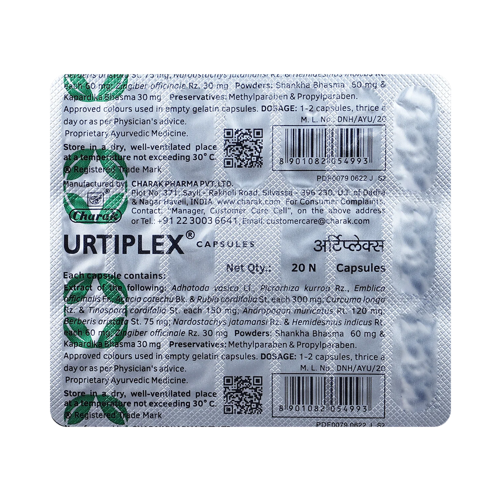 Charak Urtiplex Capsules support skin comfort and help manage itching associated with skin sensitivity and irritation. Ayurveda values herbal formulations that help maintain healthy skin balance and support natural cleansing processes of the body. This formulation contains carefully selected herbal ingredients traditionally used to support skin health and promote internal balance. By supporting natural detoxification and skin nourishment, It help maintain healthy and comfortable skin.