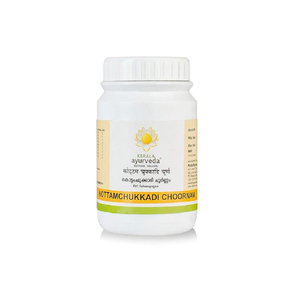 Kottamchukkadi Choornam is an Ayurvedic powder used externally to treat various Vata-related disorders, particularly pain and inflammation in joints. Renowned for its therapeutic properties, it is especially beneficial for conditions like Sciatica, Spondylosis, and Arthritis, providing relief from pain and swelling.