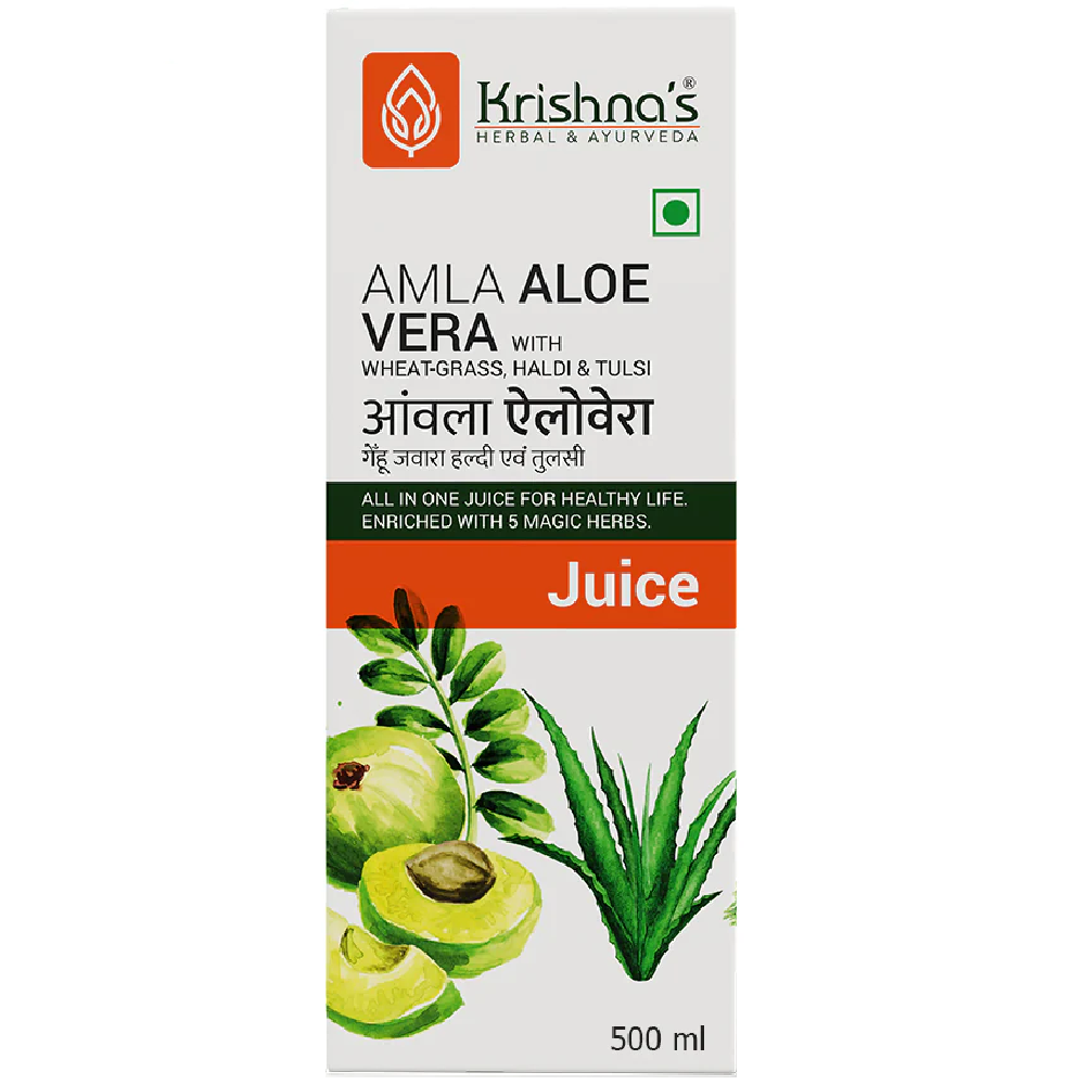 Krishna’s Herbal And Ayurveda Amla Aloe Vera WG Haldi Tulsi Juice is a powerful herbal blend of amla, aloe vera, wheatgrass, haldi (turmeric), and tulsi, each known for its unique therapeutic properties. Together, these ingredients help purify the blood, reduce inflammation, strengthen immunity, and support respiratory and liver health. This juice offers a comprehensive approach to overall wellness, rejuvenating the body and protecting it from everyday stress and toxins.