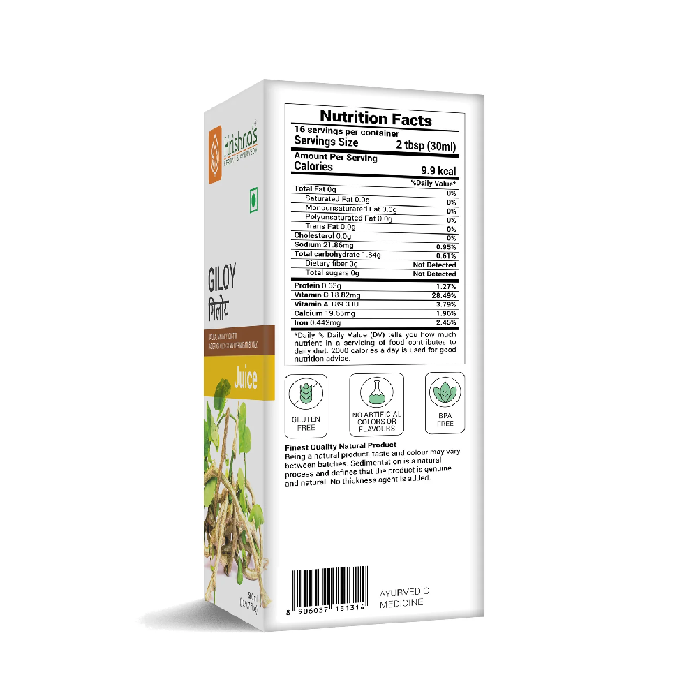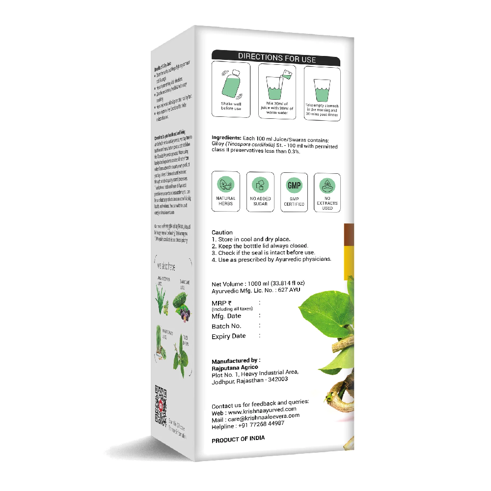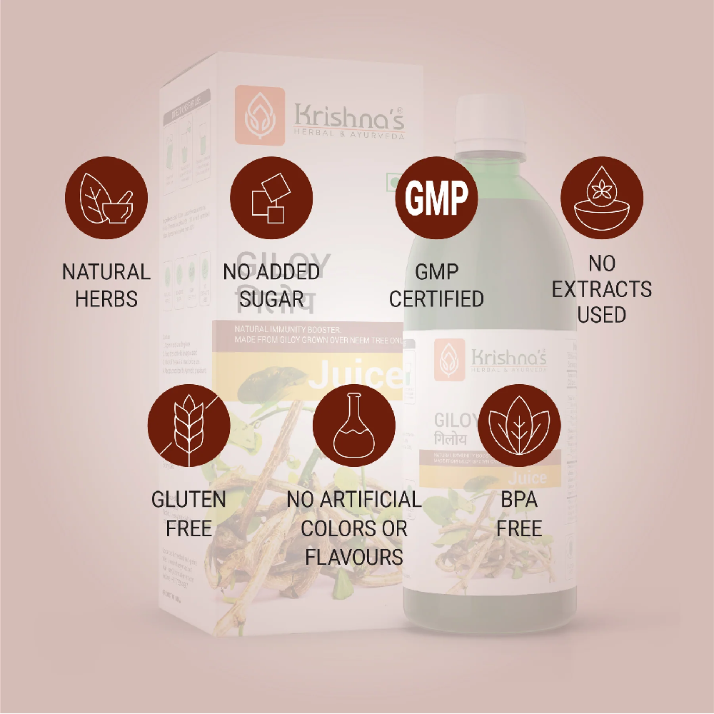 Krishna’s Giloy Juice is a classical Ayurvedic herbal formulation that supports immunity and promotes internal detoxification. Ayurvedic practice values giloy for its role in strengthening the body’s natural defense system, supporting metabolic balance, and maintaining overall internal harmony. It is prepared from carefully processed giloy with strict attention to quality, purity, and consistency for regular use.