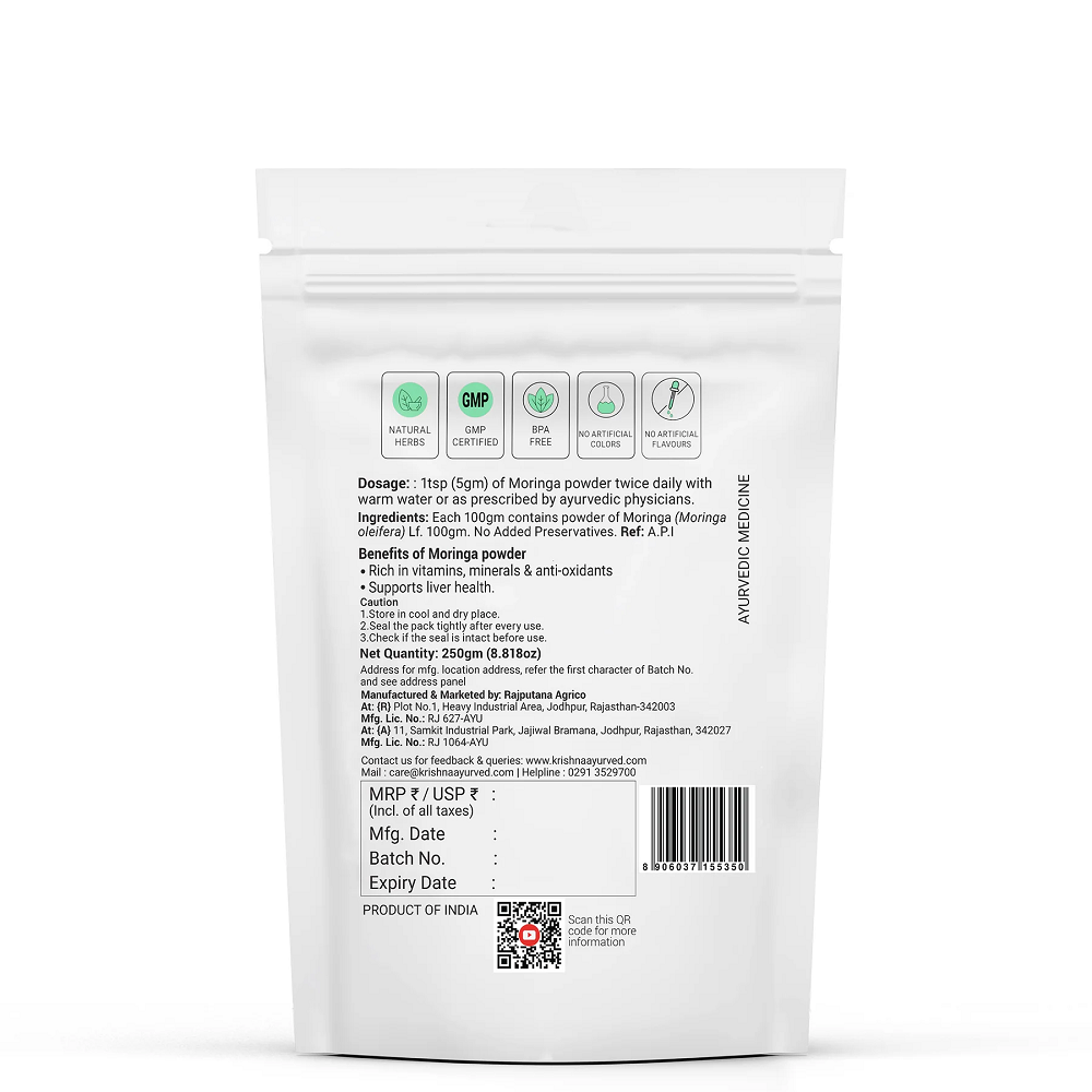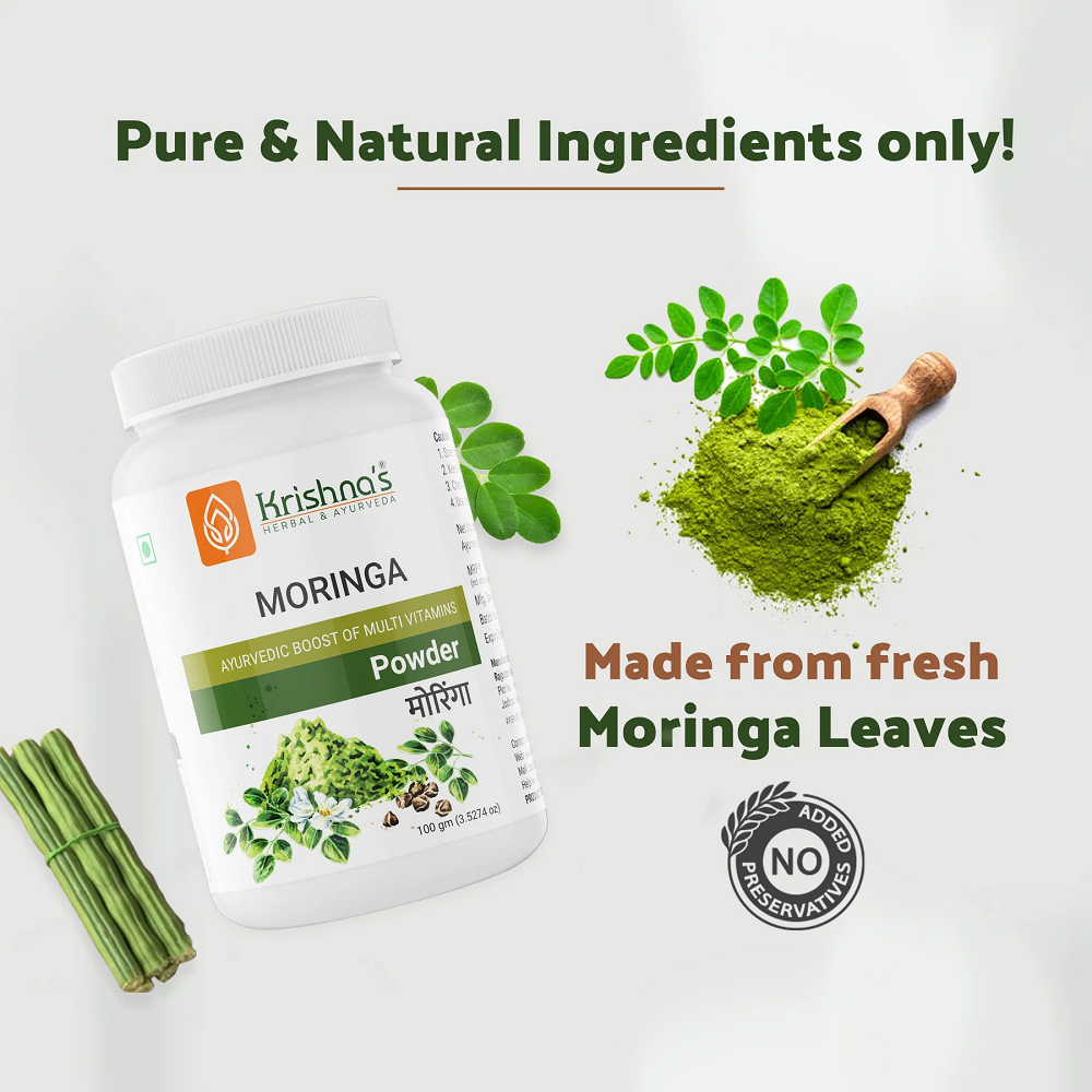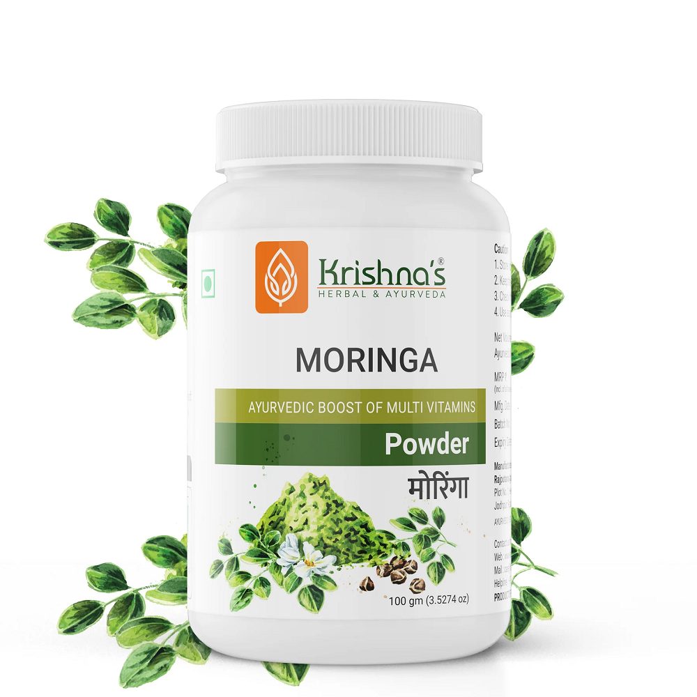 Krishna’s Moringa Powder is a classical Ayurvedic formulation that supports nutrition, energy, and overall wellness. Ayurvedic practice values such preparations for boosting vitality, strengthening immunity, and promoting balanced nutrition. It contains Moringa, a nutrient-rich herbal ingredient known for providing essential vitamins and minerals while supporting energy levels. Ayurveda has widely used this herb to maintain strength and support overall body nourishment. The manufacturer follows strict Ayurvedic principles and quality standards to ensure consistency, purity, and safe use under professional guidance.