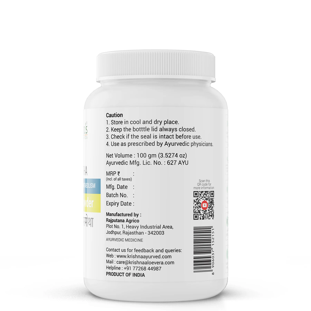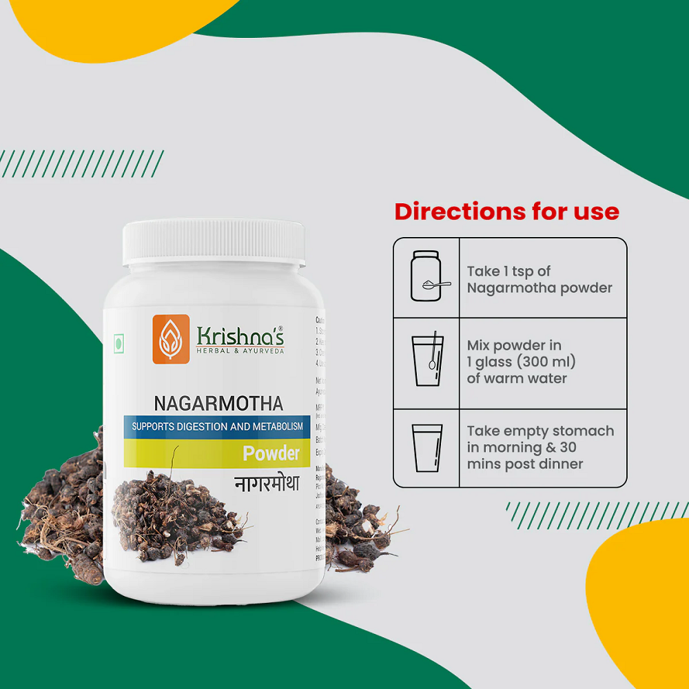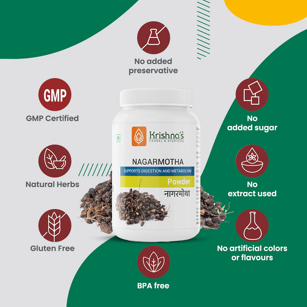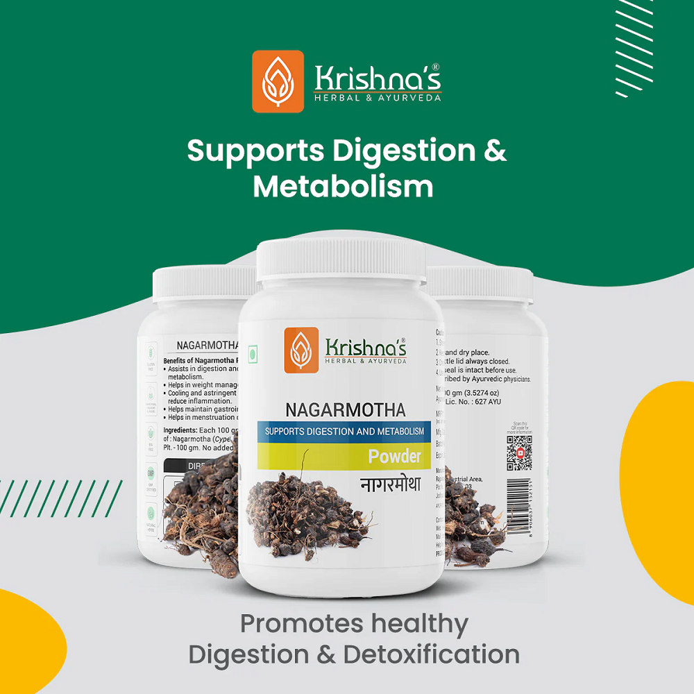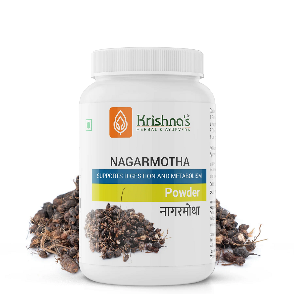 Krishna’s Nagarmotha Powder is a classical Ayurvedic formulation that supports digestion and metabolic balance. Ayurvedic practice values such preparations for improving digestive strength, supporting metabolism, and promoting overall gastrointestinal wellness. It contains Nagarmotha, a traditional herbal ingredient known for enhancing digestive function and maintaining metabolic activity. Ayurveda has widely used this herb to support appetite and help maintain internal balance. The manufacturer follows strict Ayurvedic principles and quality standards to ensure consistency, purity, and safe use under professional guidance.