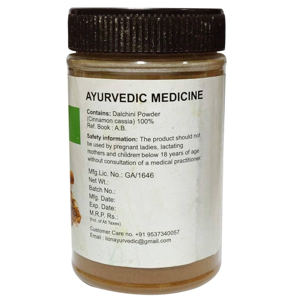 Lion Dalchini Powder is a pure Ayurvedic herbal powder made from Cinnamon (Dalchini) bark. It is known for its digestive, metabolic, and antioxidant properties. The powder helps improve digestion, regulate blood sugar, and enhance metabolism. It also supports immunity, provides natural detoxification, and promotes overall wellness. Regular use can aid in boosting energy, reducing inflammation, and maintaining general body balance.