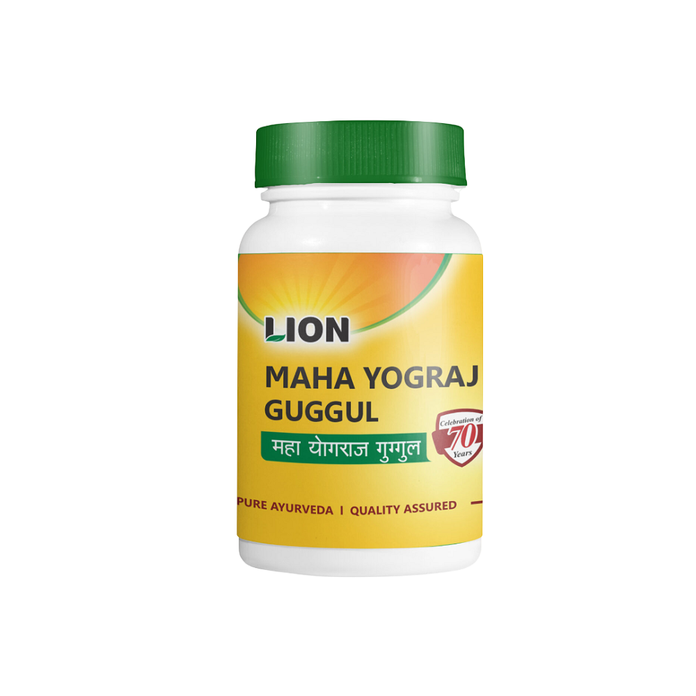 Lion Mahayograj Guggul is a classical Ayurvedic formulation widely used for managing joint pain, stiffness, and inflammation. It supports healthy bone and joint function, improves mobility, and helps in conditions like arthritis, gout, and rheumatism. Enriched with guggul and a blend of herbs, it aids in detoxification, balances Vata dosha, and enhances metabolism. It is also beneficial in relieving muscle pain and supporting overall musculoskeletal health.