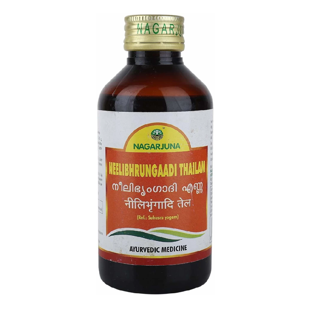 Nagarjuna Ayurveda Neelibhrungaadi Thailam is a premier herbal oil specifically formulated to promote hair growth and maintain overall scalp health. It is applied externally to the scalp to help nourish the hair roots, prevent premature graying, and reduce the frequency of hair fall. This oil works by cooling the head and providing essential herbal nutrients to the follicles, which results in thicker, darker, and more lustrous hair over time. It is a favorite choice for individuals seeking a natural solution for thinning hair or those looking to improve their hair’s natural texture and shine. By calming the mind and soothing the sensory organs, it also promotes better sleep and a relaxed mental state. It is a trusted traditional remedy for long-term hair beauty and vitality.