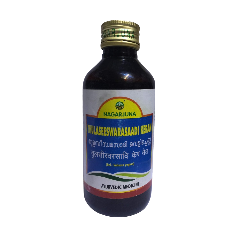 Nagarjuna Ayurveda Thulaseeswarasaadi Keram is a specialized herbal coconut oil formulated to provide natural sinus relief and support respiratory comfort. It is applied externally to the scalp and forehead to help the body clear the pathways and reduce the heaviness associated with nasal congestion and sinusitis. This oil works by utilizing the properties of Holy Basil and other herbs to balance the internal energies and soothe the head and neck region. It is particularly helpful for individuals experiencing the discomfort of a heavy head or minor breathing difficulties caused by seasonal changes. By providing a refreshing and clearing effect, it ensures a more comfortable and light feeling for the user. It is a reliable choice for maintaining upper respiratory wellness naturally.