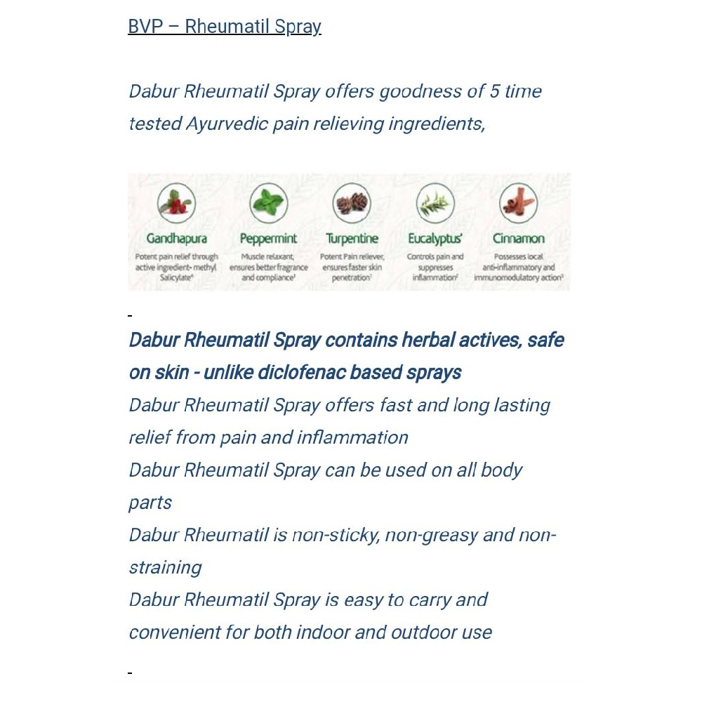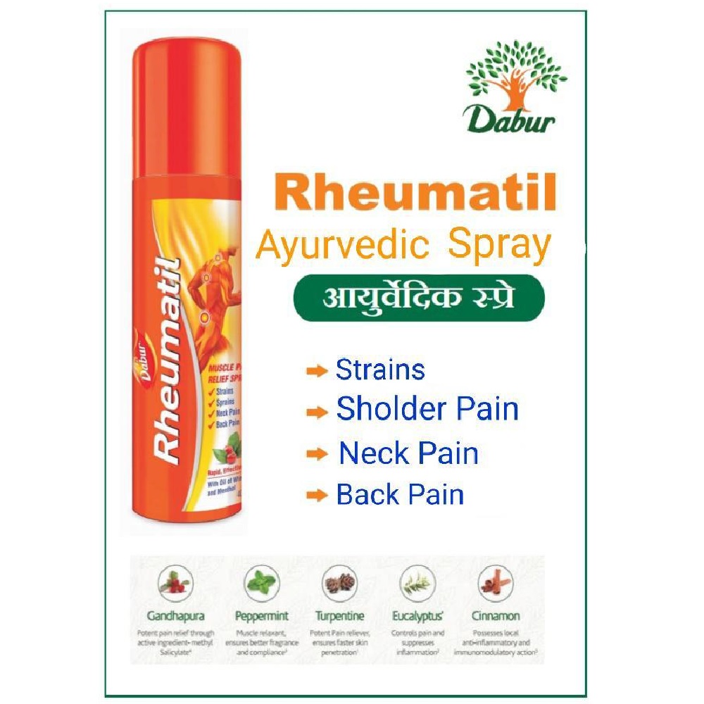 Rheumatil Spray contains herbal actives, safe on the skin – unlike diclofenac based sprays Rheumatil Spray offers fast and long-lasting relief from pain and inflammation Rheumatil Spray can be used on all body parts Rheumatil is non-sticky, non-greasy, and non-straining Rheumatil Spray is easy to carry and convenient for both indoor and outdoor use Rheumatil Spray offers the goodness of 5 times tested Ayurvedic pain-relieving ingredients.