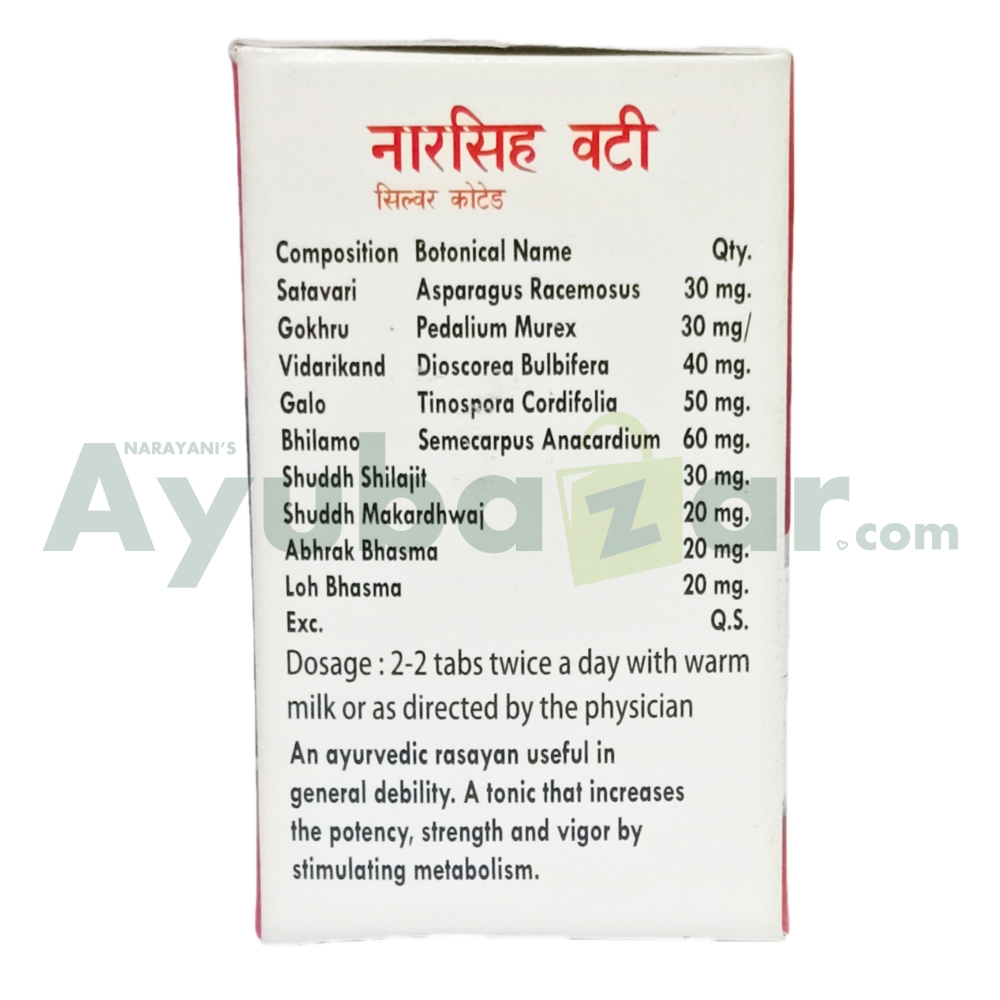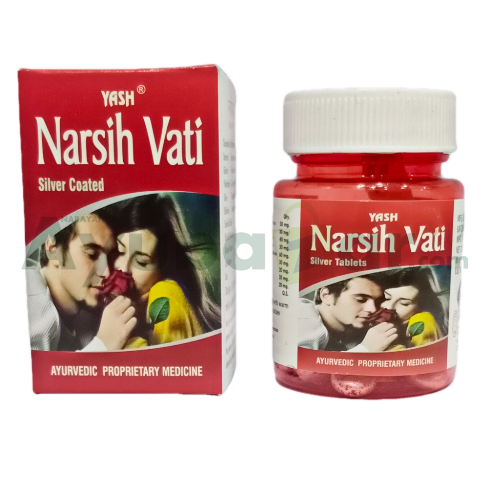 Yash Remedies Narsih Vati (Silver) is a premium Ayurvedic tonic enriched with silver bhasma and traditional herbs that rejuvenate strength and stamina. Known for its aphrodisiac and vitality-enhancing properties, it boosts physical performance and combats weakness. This formulation helps restore energy levels, build immunity, and support men’s wellness. It is ideal for those dealing with fatigue, low energy, or general debility.